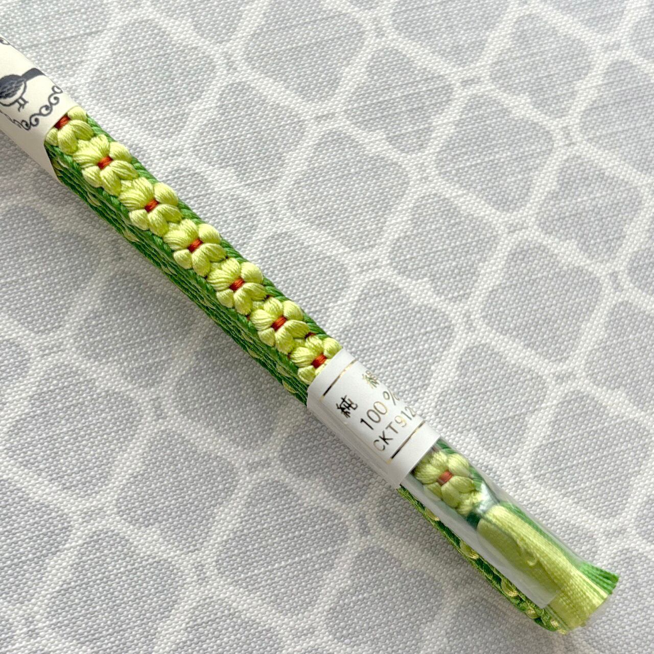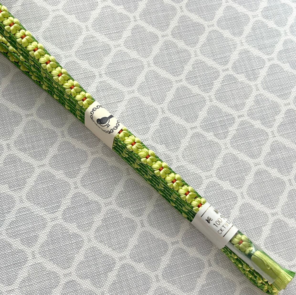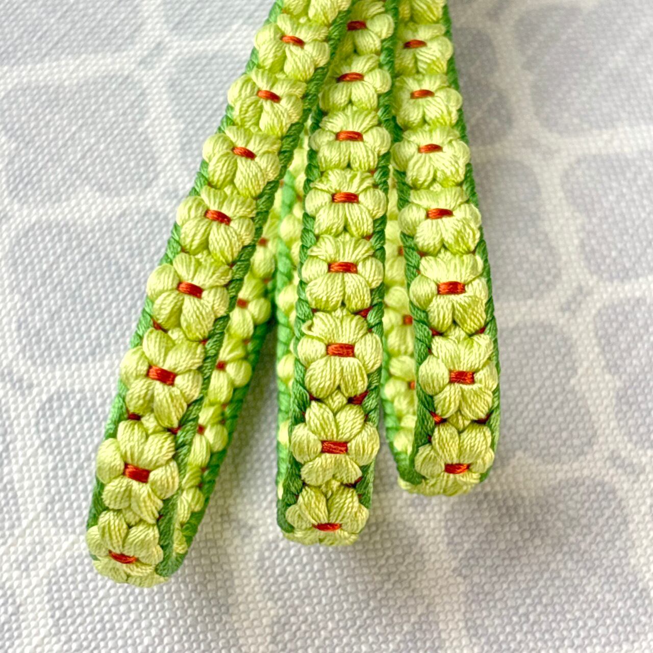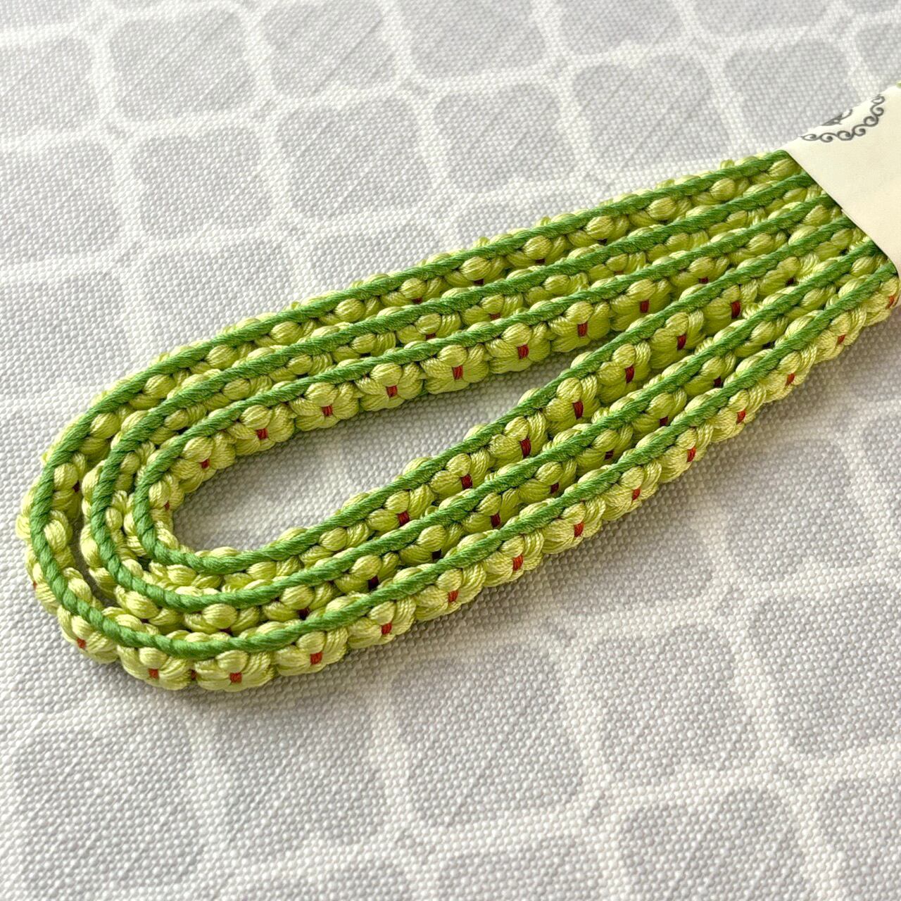たっぷりの絹糸を使って組み上げた三分紐は、お花が立体的にぷくぷくと浮き上がっているのが特徴的でとても素敵です。細い紐ですが、主役級の存在感。